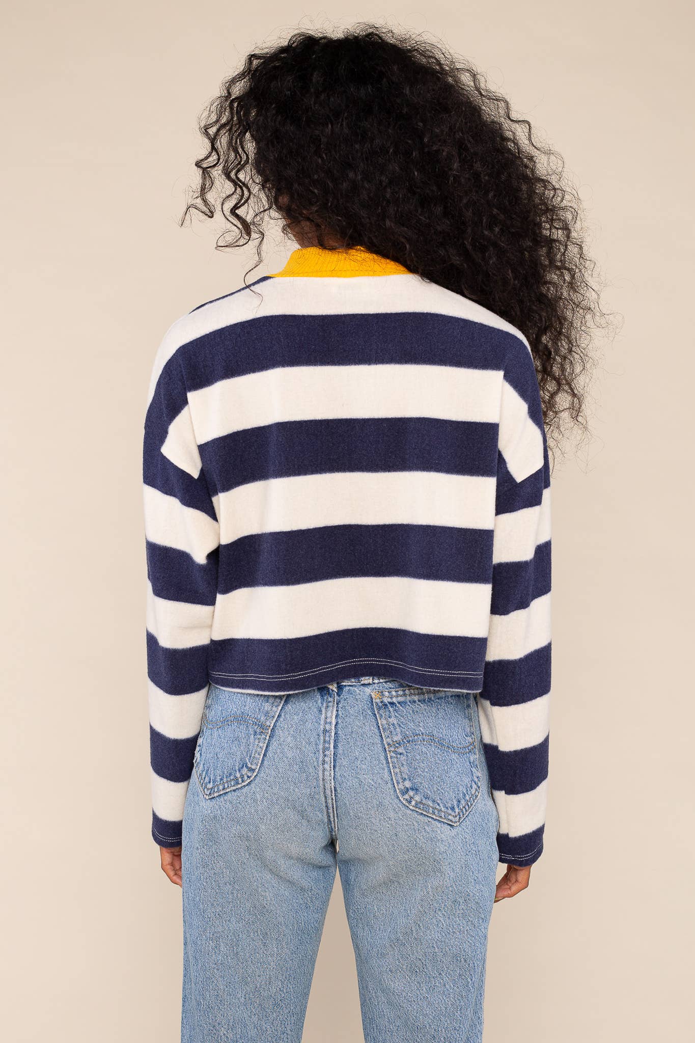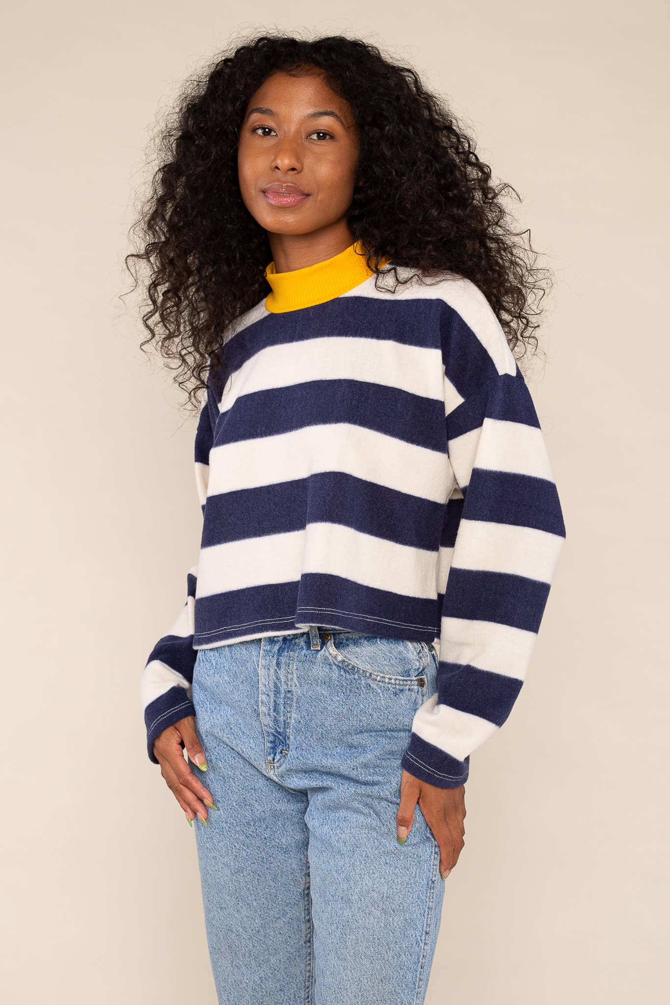 The Andy Top features super soft fleece fabrication with a cotton ringer mock turtleneck. The fit is cropped, boxy & wide with long sleeves and contrasting Rugby stripes.